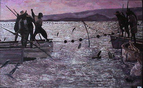 N°31 Pêche miraculeuse à Rodrigues ( couteau) HST 116 X 73 exposition au Salon International du Val d'Or 2005